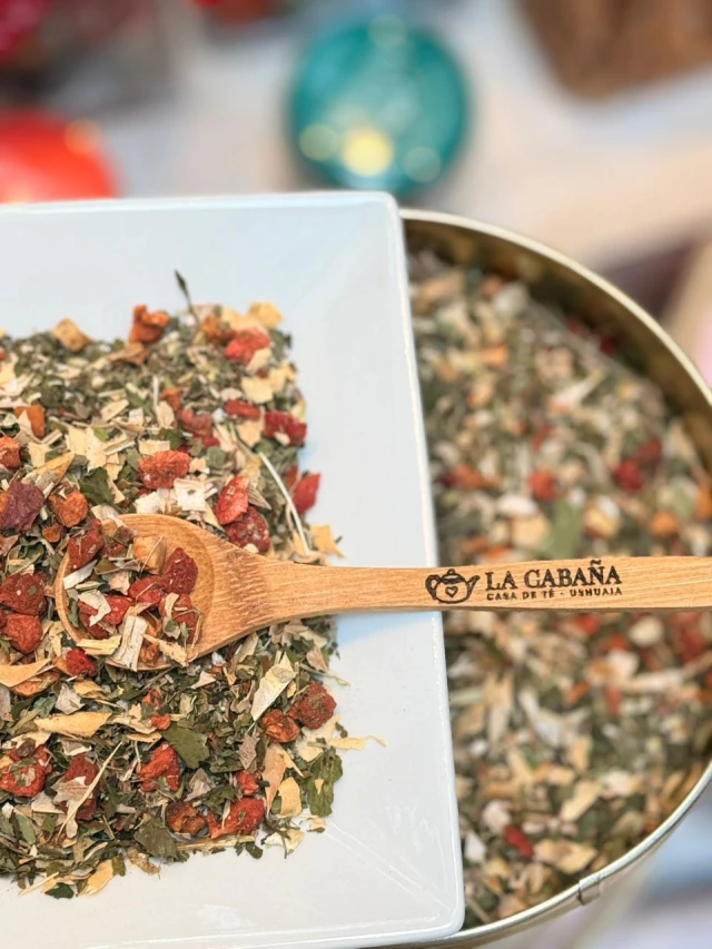Pedacitos de manzana, hojas de ortiga, hojas de frutos rojos, menta (10%), trozos de frutillas(5%).